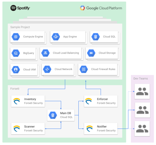 Forseti is comprised of different components with specialized use cases. As a first step, the tool takes a snapshot of the current infrastructure by building an inventory of every active resource. Secondly it runs different scanners on the snapshot to highlight security misconfigurations. Every violation discovered will raise an alert.