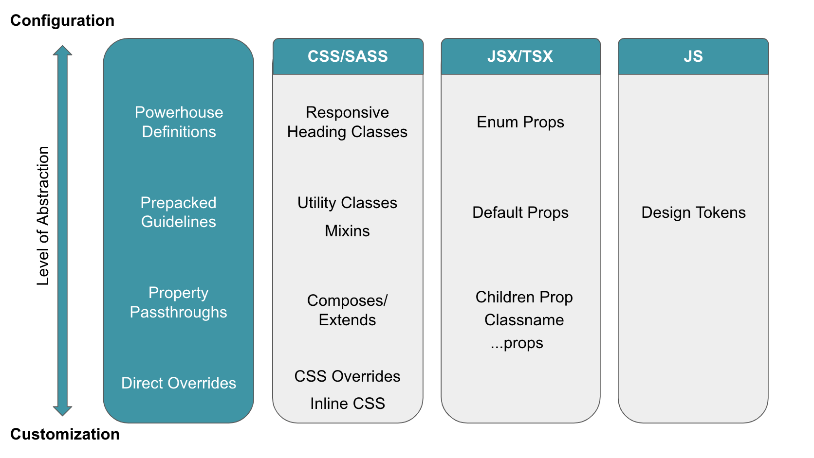 Powerhouse definitions: By assigning a definition to a whole set of underlying properties, this category of abstraction can get a lot done without a ton of input from the end user. Configurations like enum props allow us to add configuration to our components in a semantic way, while remaining typesafe.